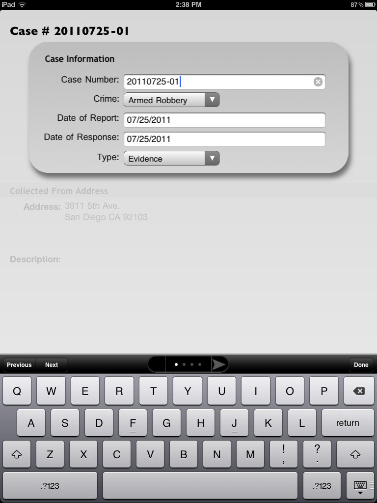 Enter case information. Enter case or incident number, crime type, dates of report and response, type of evidence, and address or location of crime. Reduce documentation time with autofill of address and GPS coordinates.