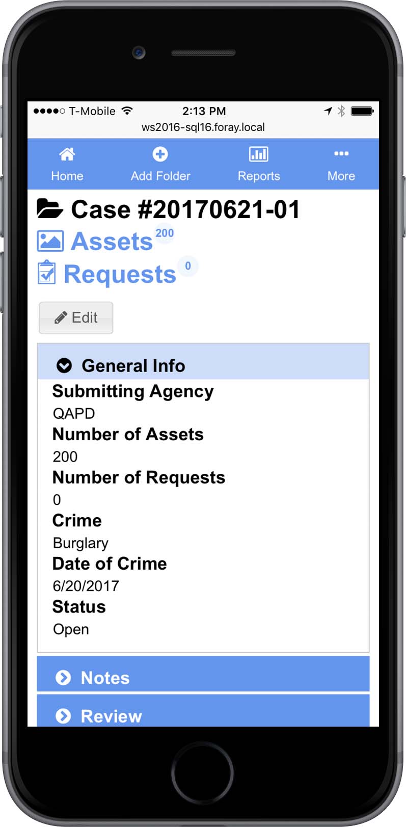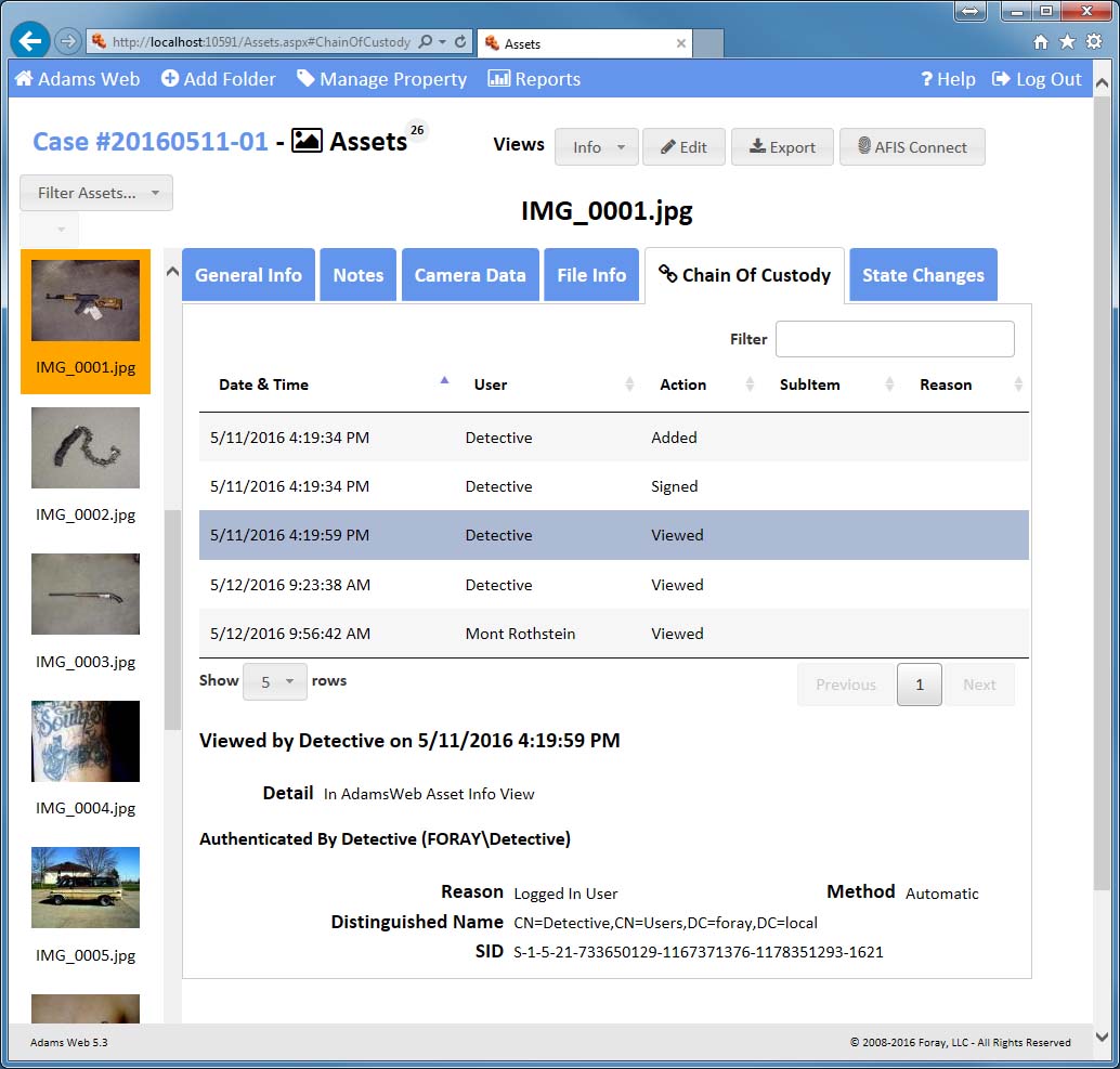 Track chain of custody. View all changes made to photo/video details, including crime type, evidence category, notes, chemical and dye processing, lighting, etc.