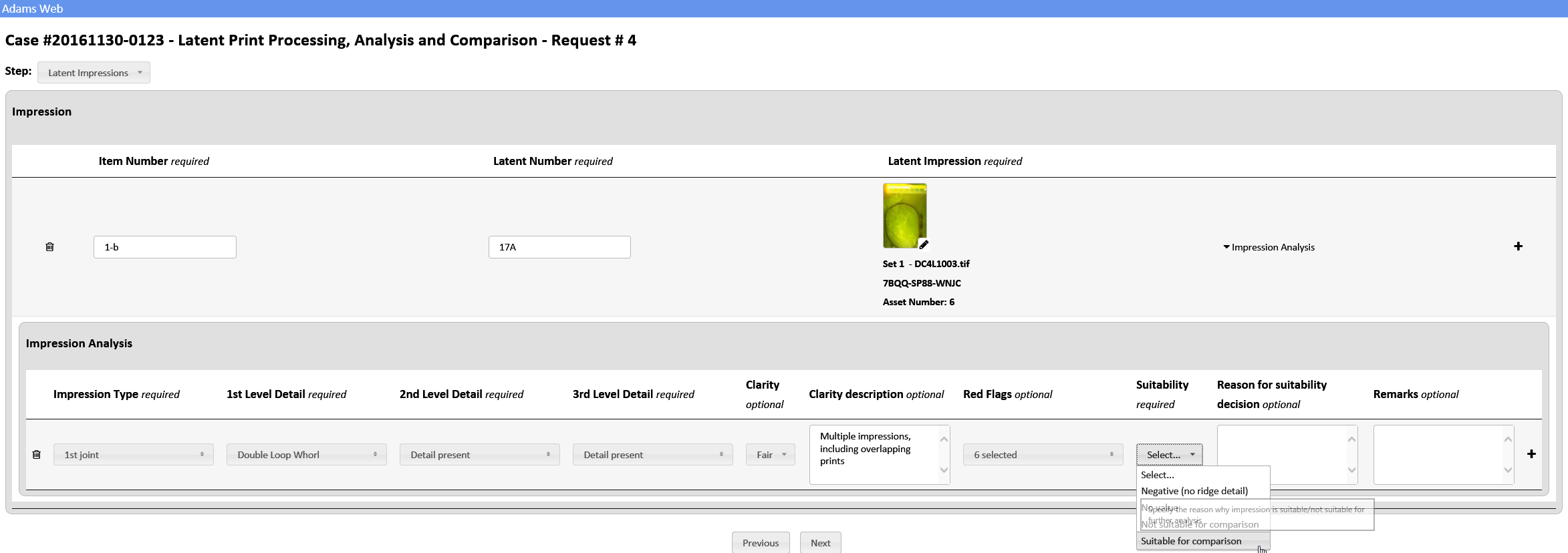 The ADAMS Latent Case Management and ACE-V Documentation (Latent/ACE-V) Module ensures complete compliance with SWGFAST's ACE-V guidelines, and provides an intuitive, browser-based process for documentation required as part of the latent case management record. The Latent/ACE-V Module allows users to create and maintain complete–and consistent–records that include annotated images of the latent prints and exemplars, as well as observations and other data relevant to the ACE-V process, together with a detailed chain of custody, case notes and reports. Users can display images for side-by-side comparison, prepare annotations (charting) on-screen, and customize the ACE-V processes based upon their agency's specific data requirements.