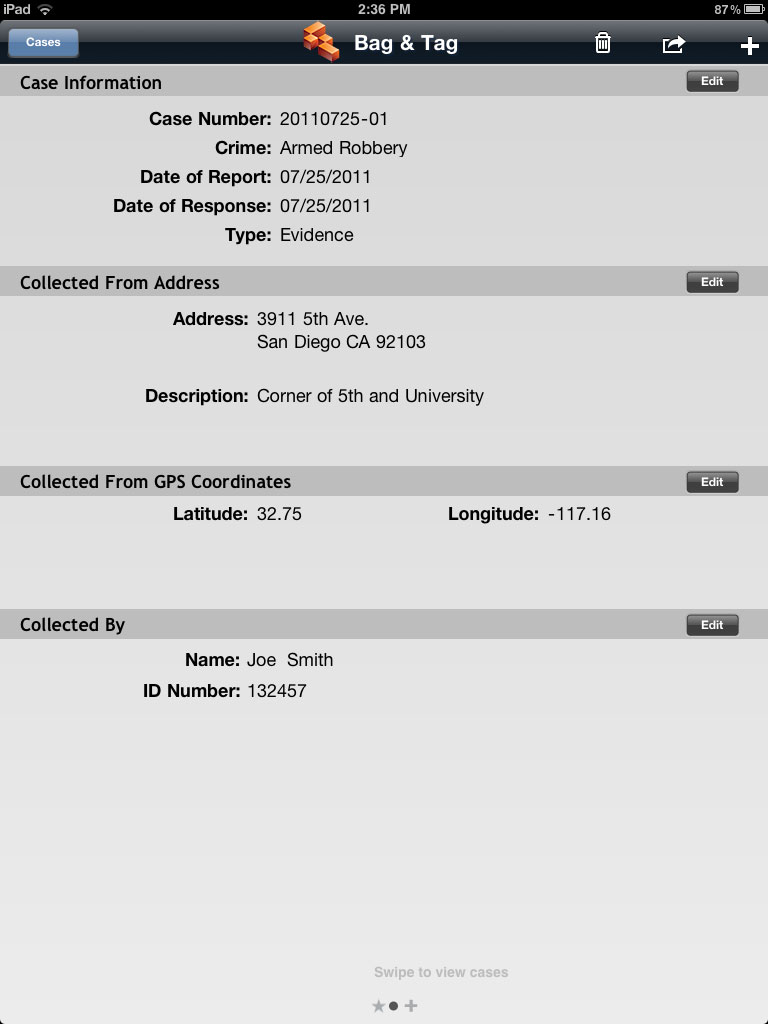 Enter case information. Enter case or incident number, crime type, dates of report and response, type of evidence, and address or location of crime. Reduce documentation time with autofill of address and GPS coordinates.