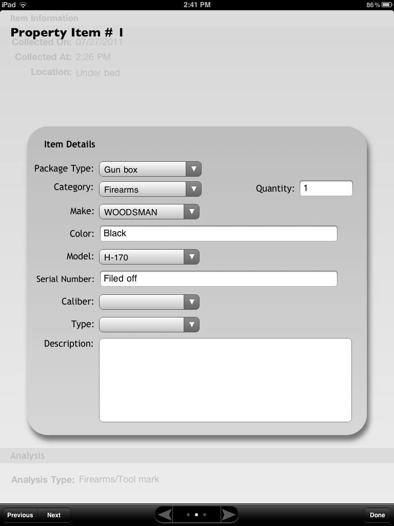 Review property items. Review each of the property items to make sure that complete descriptions and necessary details have been recorded while still at the crime scene.