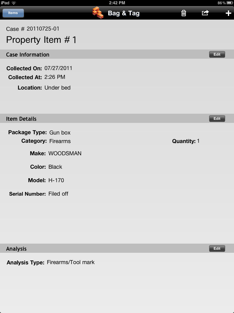 The ADAMS Crime Scene Evidence Documentation solution (Bag & Tag) is a free application for the Apple® iPad®. Now crime scene investigators and first responders can document evidence on the spot at the crime scene. No more handwritten notes, reports or labels. No more writing the same information over and over. Just one easy, intuitive application to bag, tag and document crime scene evidence.