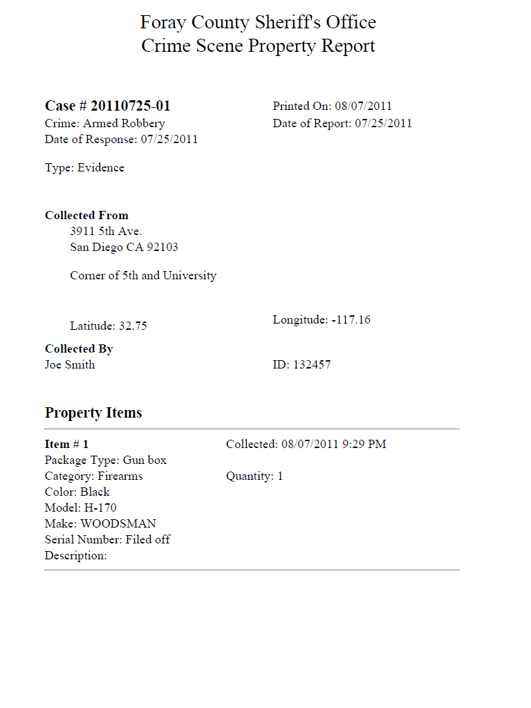 Document crime scene evidence. Document each piece of physical evidence using customized package types (gun box, latent envelope, sexual assault kit, etc.) along with agency-customized evidence categories and category-specific fields.