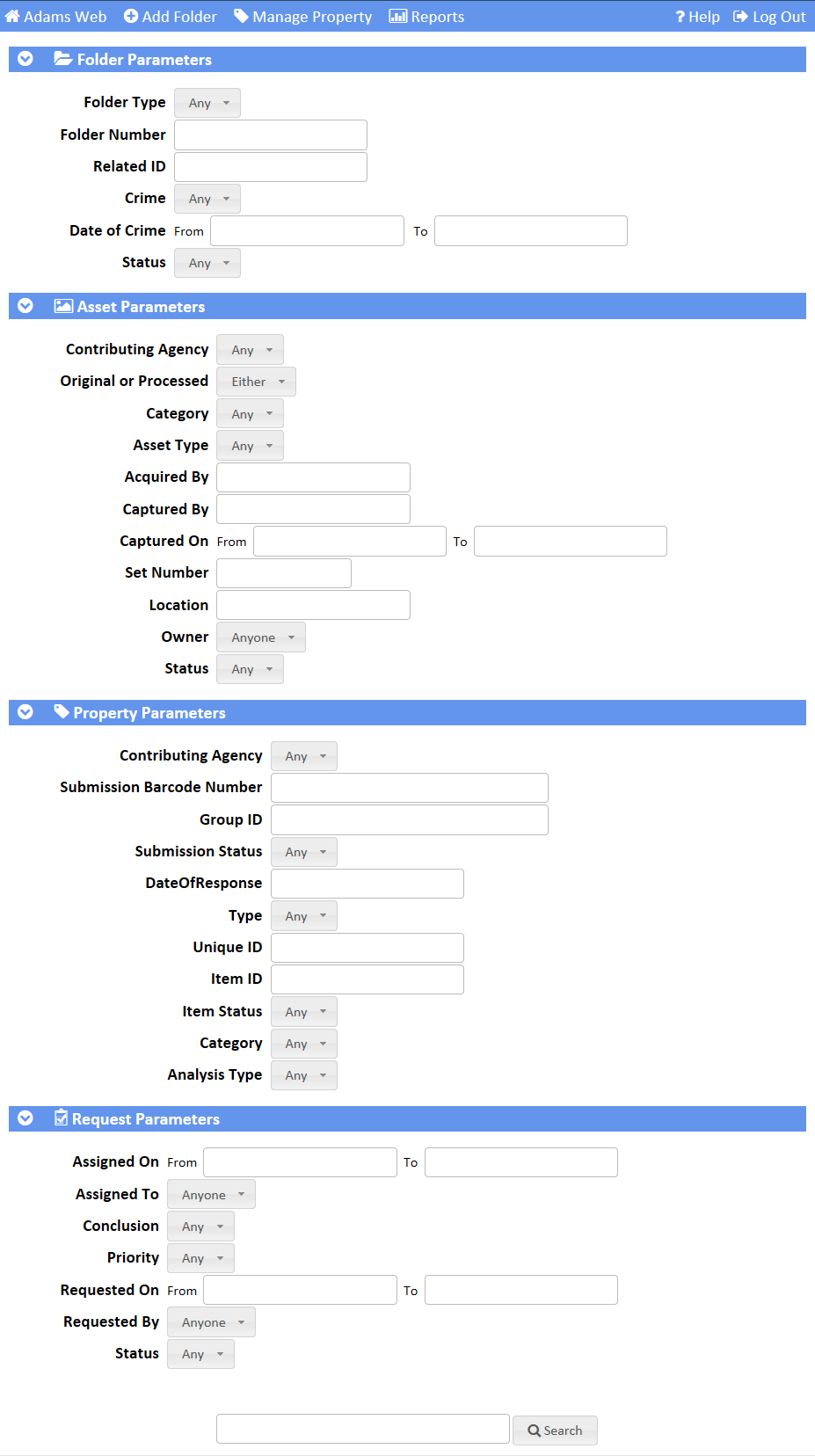 Search cases. Find your videos or photos by case number, crime type, date of crime, category, who acquired the photo/video, property item ID, analysis type, any key word, along with a multitude of other parameters to help narrow your search.