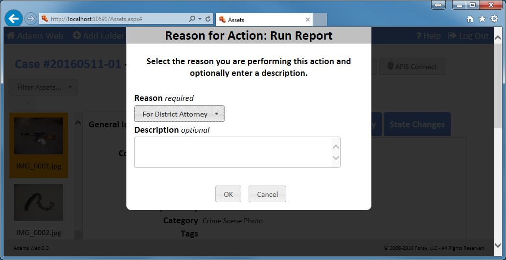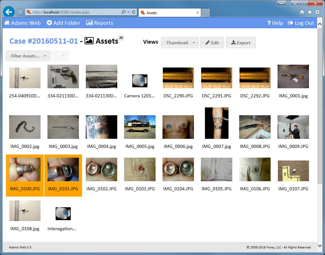 The ADAMS Crime Scene Photo/Video solution is a tool for storing, securing, locating, and controlling digital evidence gathered at crime scenes. It provides browser-based viewing of cases and digital evidence, along with comparisons of originals and processed copies. It authenticates all originals and only allows processing of copies. Crime Scene Photo/Video displays asset acquisition information (such as camera EXIF data), history of processing, and an audit trail of all access to the digital asset.