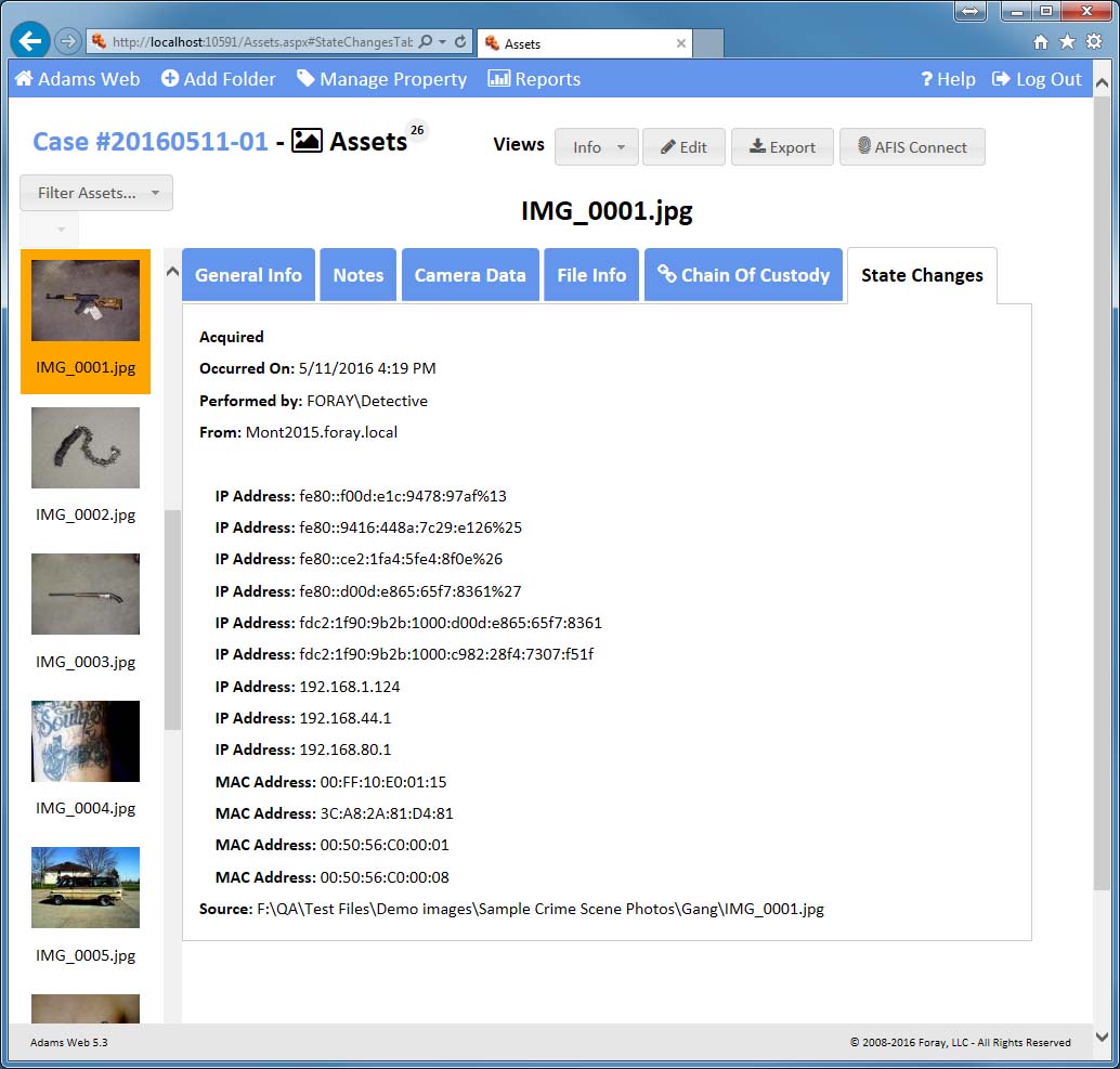 Track chain of custody. View all changes made to photo/video details, including crime type, evidence category, notes, chemical and dye processing, lighting, etc.