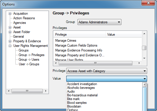 Control access. Grant/restrict access to cases by crime type, to assets by user-defined categories, etc.