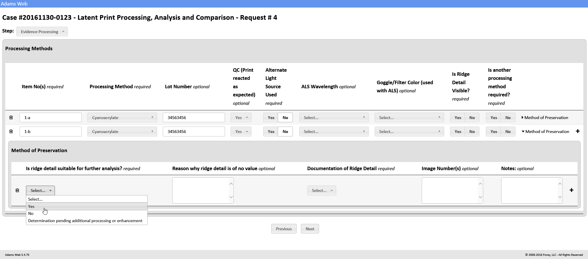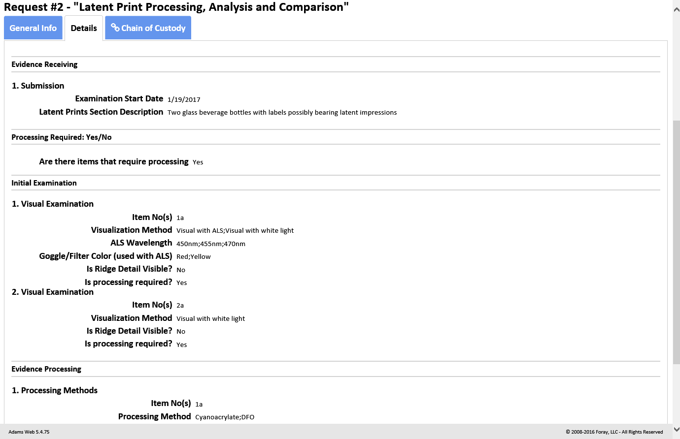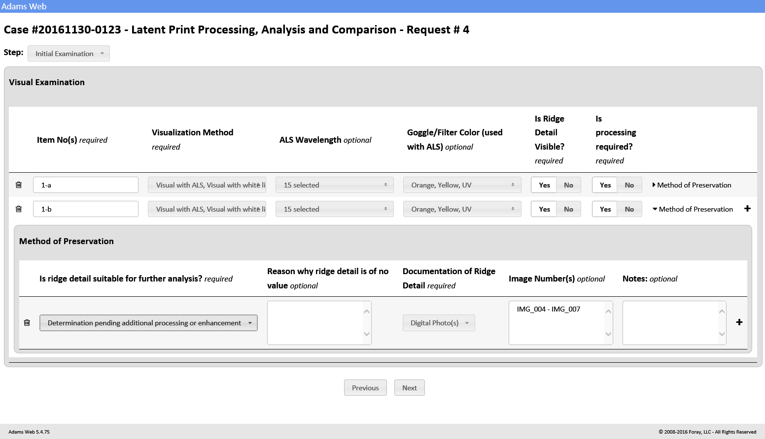 The ADAMS Latent Case Management and ACE-V Documentation (Latent/ACE-V) Module ensures complete compliance with SWGFAST's ACE-V guidelines, and provides an intuitive, browser-based process for documentation required as part of the latent case management record. The Latent/ACE-V Module allows users to create and maintain complete–and consistent–records that include annotated images of the latent prints and exemplars, as well as observations and other data relevant to the ACE-V process, together with a detailed chain of custody, case notes and reports. Users can display images for side-by-side comparison, prepare annotations (charting) on-screen, and customize the ACE-V processes based upon their agency's specific data requirements.