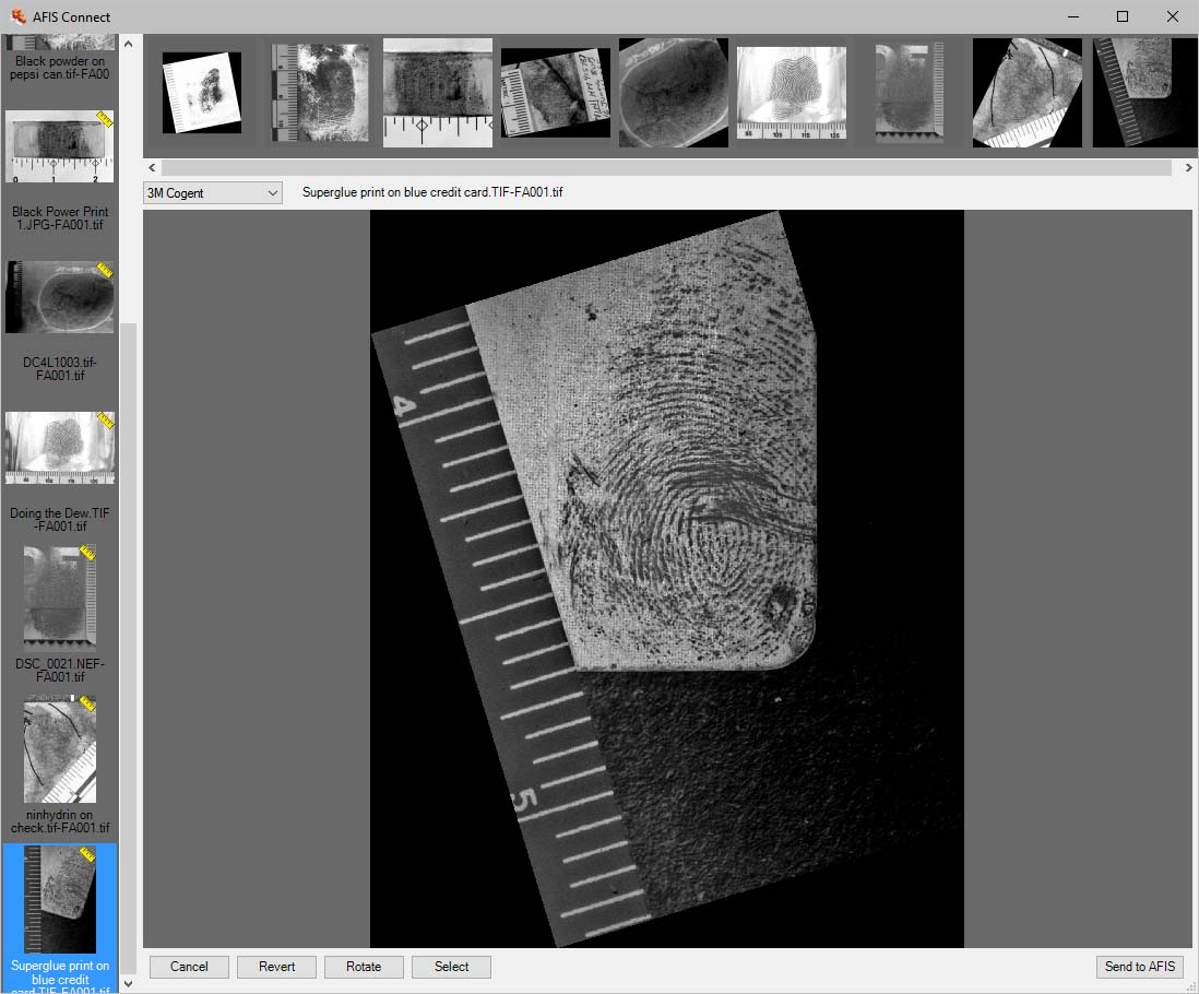 Select multiple clips. For single images containing multiple prints (palm prints or multi-print images), select multiple regions of the image and submit all regions simultaneously to AFIS.